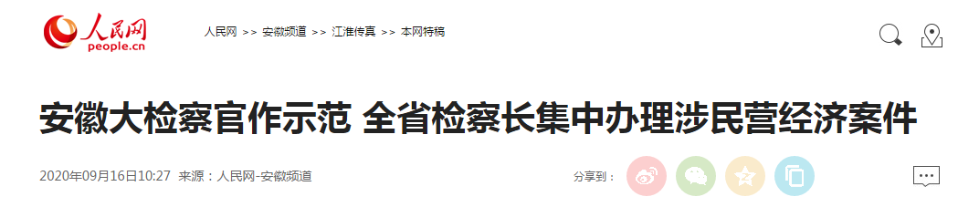 9月15日,安徽省检察院通报了全省市、县两级检察长一周内办理涉民营经济案件情况。