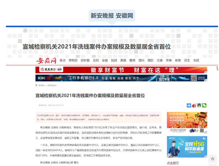 去年3月25日,安徽省检察院发布《2022年全省检察机关反洗钱典型案例》,其中郎溪县人民检察院办理的张某洗钱案成功入选全省四个典型案例之一,郎溪县检察院被省人民检察院评为“洗钱犯罪专项打击先进集体”。这也是宣城市首例自洗钱案件。