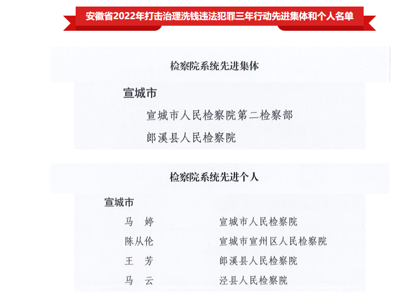 近日,安徽省反洗钱工作厅际联席会议发布了《关于表彰2022年打击治理洗钱违法犯罪三年行动成绩突出集体和个人的通报》,宣城市检察机关2个集体和4名个人获表彰。去年6月,宣城市检察院反洗钱办案团队获评全省检察机关优秀办案团队。