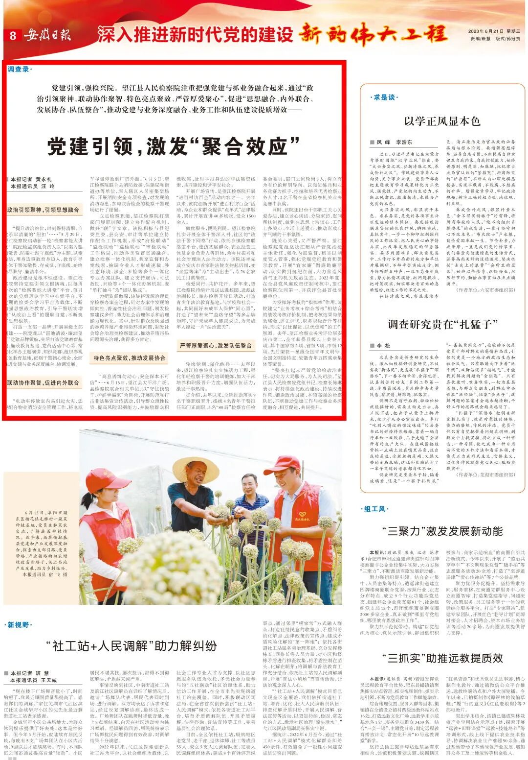 党建引领,强检兴院。望江县人民检察院注重把强党建与抓业务融合起来,通过“政治引领聚神、联动协作聚智、特色亮点聚效、严管厚爱聚心”,促进“思想融合、内外联合、发展协合、队伍整合”,推动党建与业务深度融合、业务工作和队伍建设提质增效——