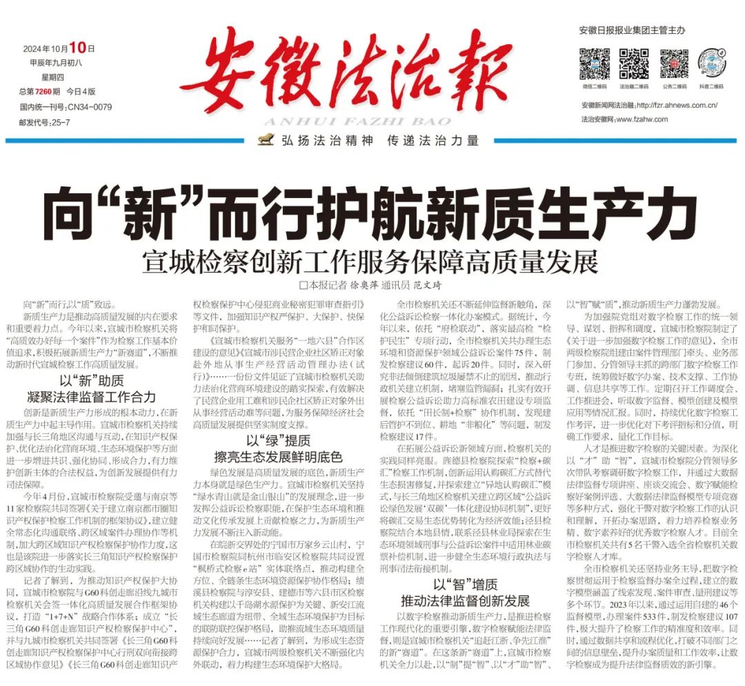 新质生产力是推动高质量发展的内在要求和重要着力点。今年以来,宣城市检察机关将“高质效办好每一个案件”作为检察工作基本价值追求,积极拓展新质生产力“新赛道”,不断推动新时代宣城检察工作高质量发展。
