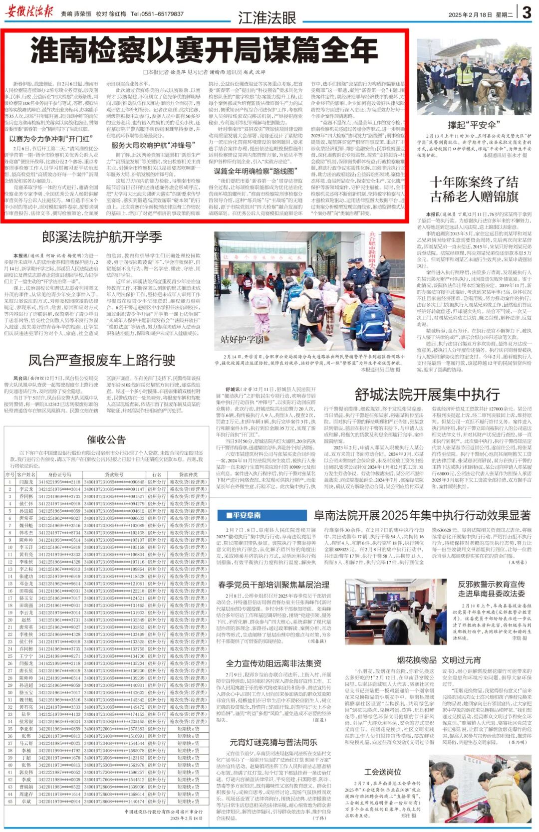 “竞赛不是终点,而是全年工作的发令枪。”淮南检察机关还通过务虚会等形式,进一步明确2025年“四大检察”协同发力“路线图”:刑事检察提质效,规范落实宽严相济刑事政策,重点打击涉众型经济犯罪,维护金融安全;民事检察强监督,深化虚假诉讼专项监督,探索“支持起诉+社会救助”机制,保障弱势群体权益;行政检察破难题,推动行政争议实质性化解,加强非诉执行监督,助力法治政府建设;公益诉讼拓领域,聚焦生态环境、食品药品安全,探索安全生产、文化遗产保护等新领域案件,守护民生福祉。同时,全市检察机关还将不断创新机制,坚持数字检察与人才强检双轮驱动,运用法律监督大数据平台,通过类案分析模型发现监督线索,推动监督模式从“个案办理”向“类案治理”转变。