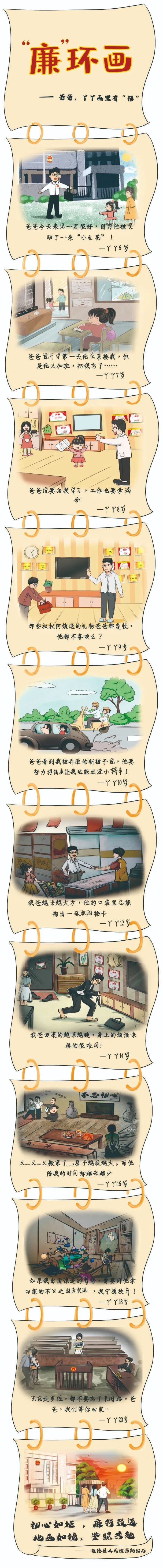 廉政主题漫画《“廉”环画》以女儿丫丫不同年龄段所画的画为视角,观察到身为公职人员的父亲,从正派清廉一步步腐化的过程。整幅漫画通过展示不同的画,隐喻随着场景切换,时间流逝,父亲的初心逐渐丢失,出现了作风和腐败问题。整幅作品虽不言廉,但处处是廉,结尾最后一幅画与第一幅画的场景相同,形成闭环,表达如果丫丫父亲在人生中的每环都始终廉洁奉公,结局就如最后一幅画一样美好,暗喻“不忘初心,方得始终”,突出“廉”环画的主题。