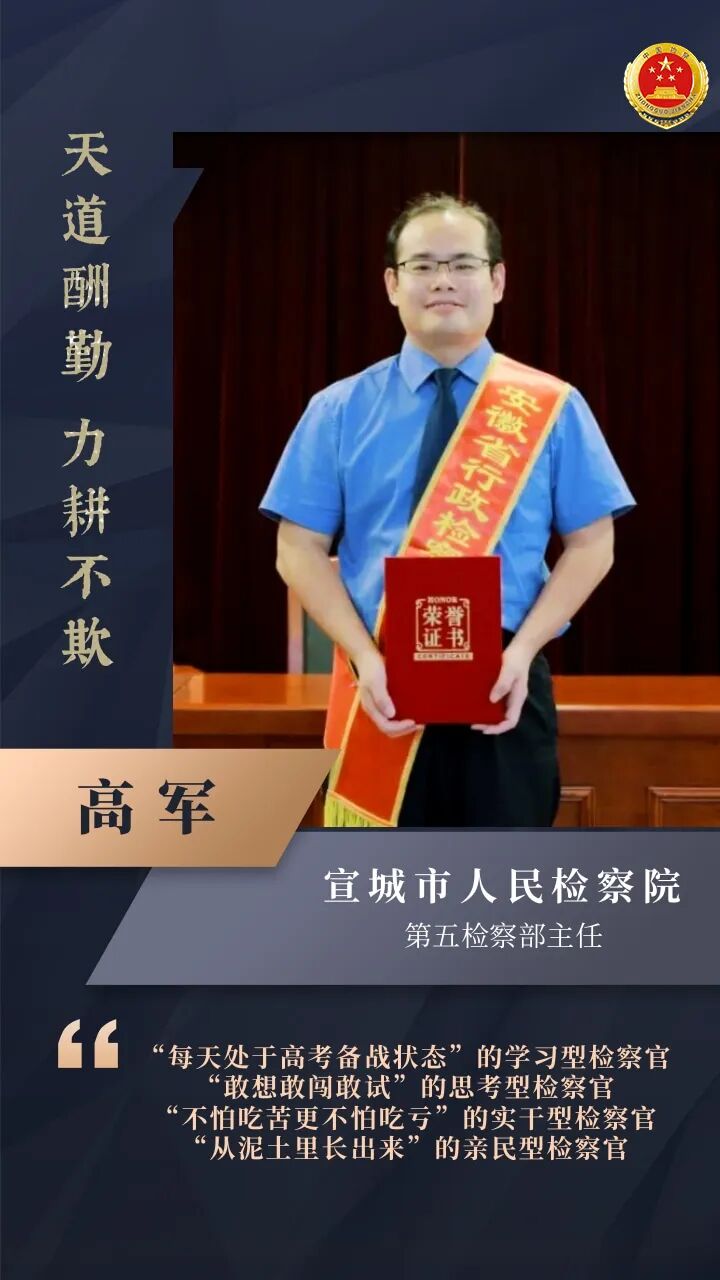 他是全省行政检察条线优秀检察官,以第一名的成绩获得全省第一届行政检察业务标兵称号;他编写的案例被最高检确定为指导性案例,成为安徽检察机关在行政检察条线首例指导性案例,并为全国检察系统行政检察干警进行业务培训;他以自己出色的业务能力、不怕吃苦吃亏的毅力、敢闯敢试的魄力为新时代法律监督贡智献力……他就是宣城市人民检察院第五检察部主任高军。
