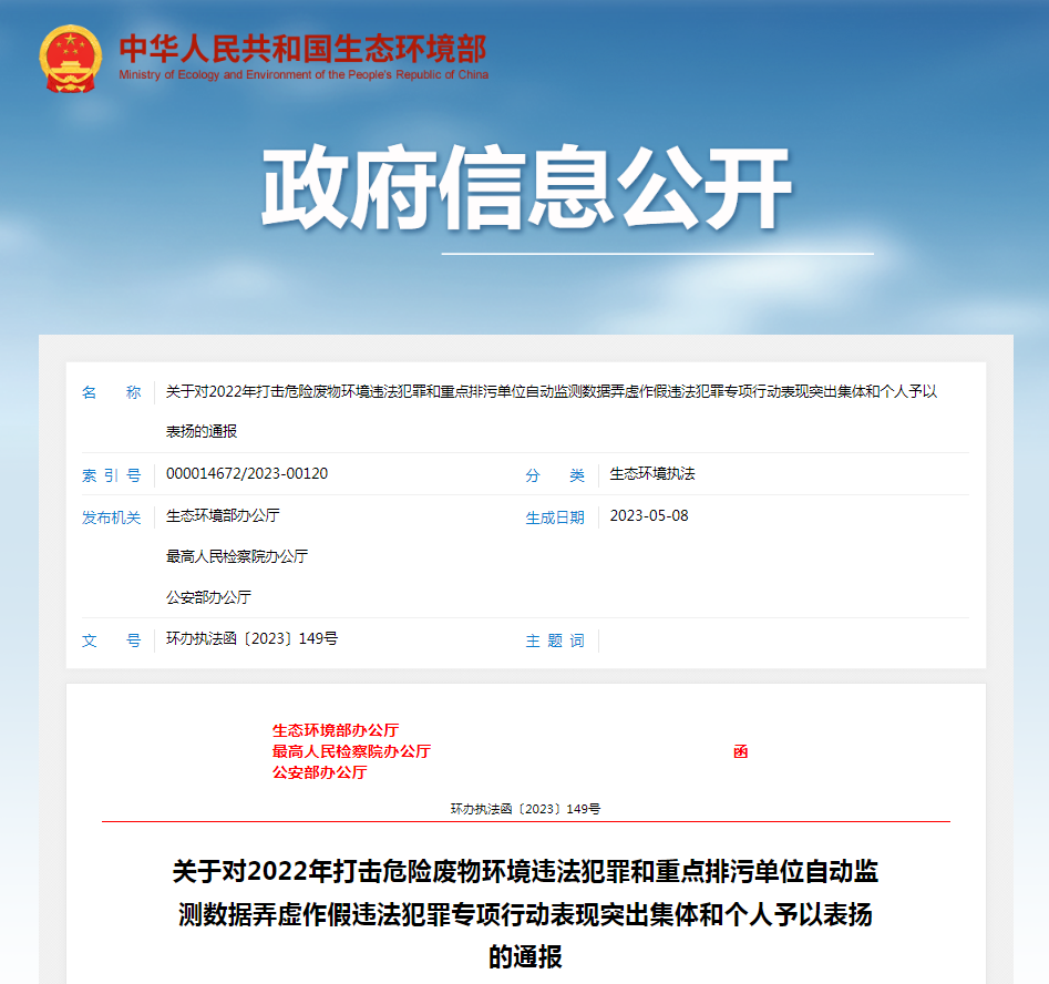 5月8日,生态环境部网站发布《关于对2022年打击危险废物环境违法犯罪和重点排污单位自动监测数据弄虚作假违法犯罪专项行动表现突出集体和个人予以表扬的通报》,对“两打”专项行动中表现突出的90个集体和150名个人予以通报表扬。