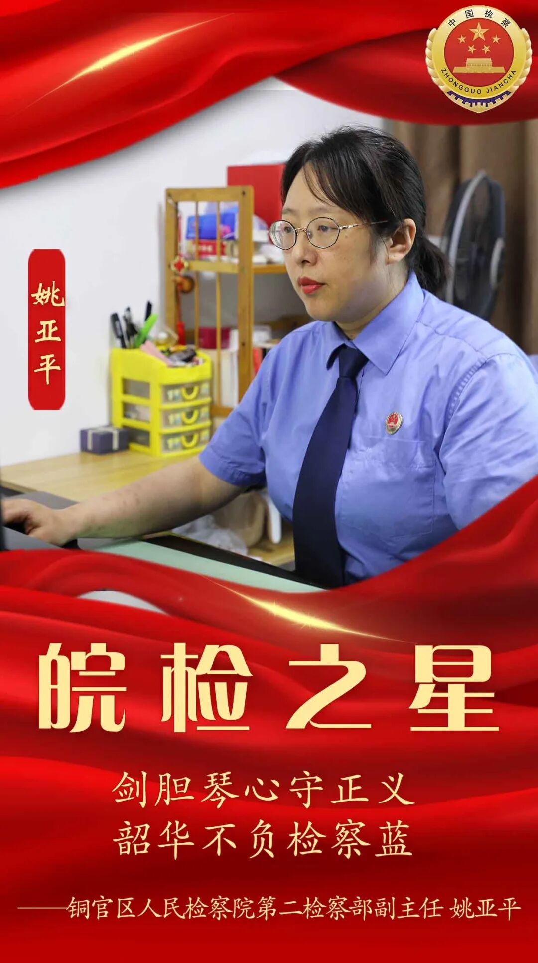 姚亚平,现任铜陵市铜官区人民检察院第二检察部副主任、检委会委员、一级检察官。她先后获得安徽省检察机关侦查监督系统优秀检察官、安徽省维护妇女儿童权益先进个人、安徽省卷烟打假先进个人、安徽省优秀办案检察官等多项荣誉称号,办理的两起案件分别入选2021年和2022年安徽省检察院经济类典型案例。