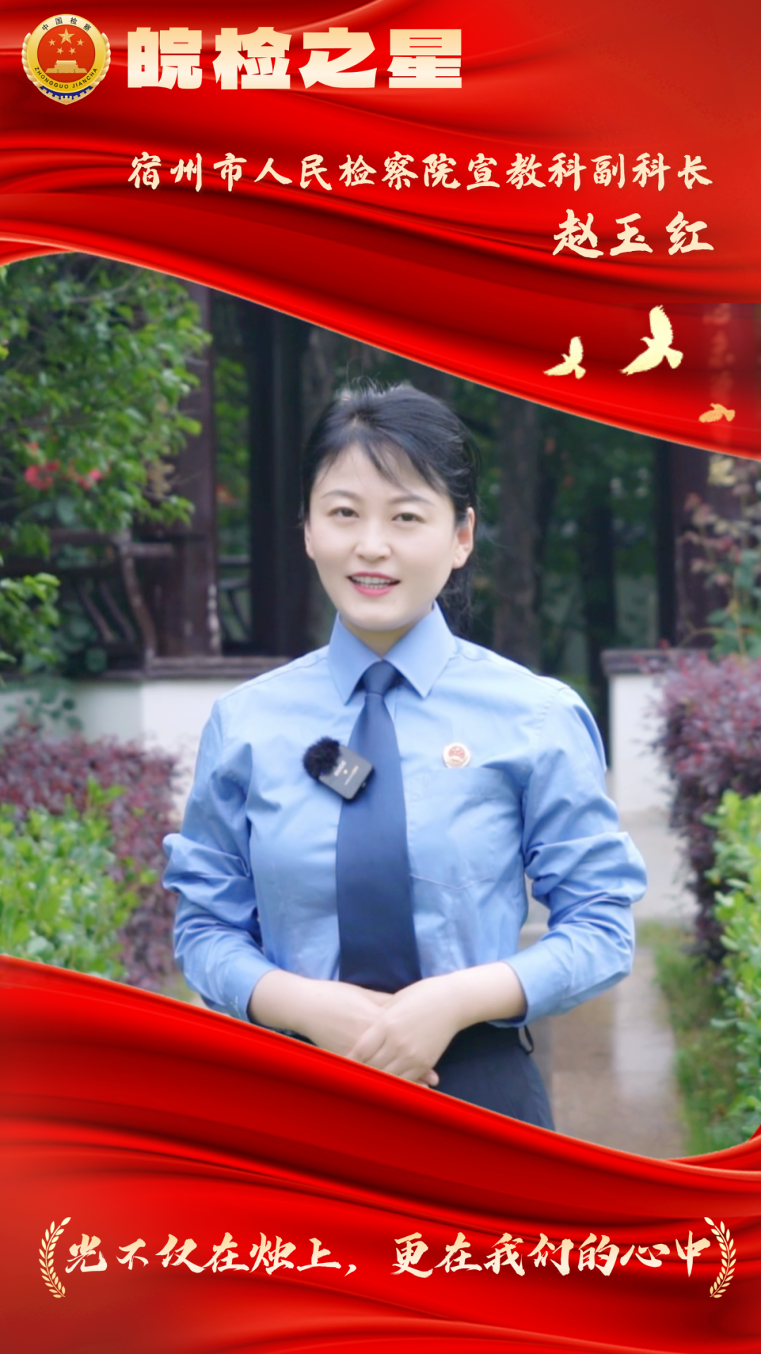 赵玉红,宿州市人民检察院宣教科副科长、三级主任科员。一个性格爽朗、热情大方的姑娘,大大的眼睛笑起来像蕴着一泓秋水,仿佛随时都能发现新鲜的新闻点、迸发出灵动鲜活的好点子。从检近十年来,她始终在新时代法治宣传道路上勤奋耕耘、默默“追光”——助力该院宣教科荣立省集体二等功、获评省“七五”普法先进集体及市“优秀网络正能量建设者”等荣誉,她也连续三年荣获“全国检察宣传先进个人”、先后荣立三等功两次,并入选全国首批“检察新闻宣传人才库”,荣获市“‘七五’普法中期先进个人”。