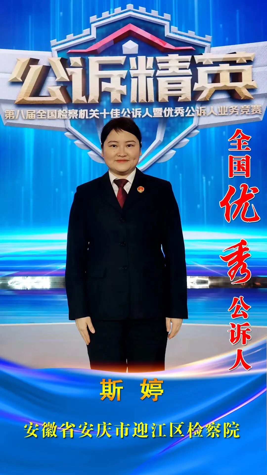 斯婷,女,1989年出生,2014年参加检察工作,现任安庆市迎江区人民检察院第一检察部主任。从检以来,她始终坚守在办案一线,凭着对检察事业的执着追求和对人民群众高度负责的态度,锐意进取、勤奋工作,不断突破自我,磨砺出了突出的工作能力和良好的业务水平。她优质高效办理了600余件案件,起诉准确率达100%,无一错案,先后荣获安庆市迎江区“十佳优秀政法干警”、安庆市“扫黑除恶先进工作者”、安庆市“公诉业务标兵”“最佳辩手”、安徽省“十佳公诉人”“优秀辩手”、“全国优秀公诉人”等称号。