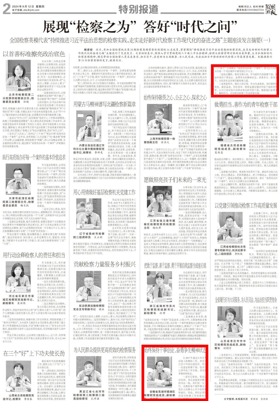 近日,参加全国检察机关第25期检察英模荣誉休假团的31名成员,紧紧围绕“持续推进习近平法治思想的检察实践,走实走好新时代检察工作现代化的奋进之路”主题进行了交流发言。大家纷纷表示,要深入学习贯彻党的二十届三中全会精神,按照大检察官研讨班的决策部署,大力弘扬新时代检察英模精神,模范带动全国检察人员求真务实、担当实干,在更好为大局服务、为人民司法、为法治担当中推动新时代检察工作高质量发展。《检察日报》摘要刊登31位检察英模的发言,敬请关注。