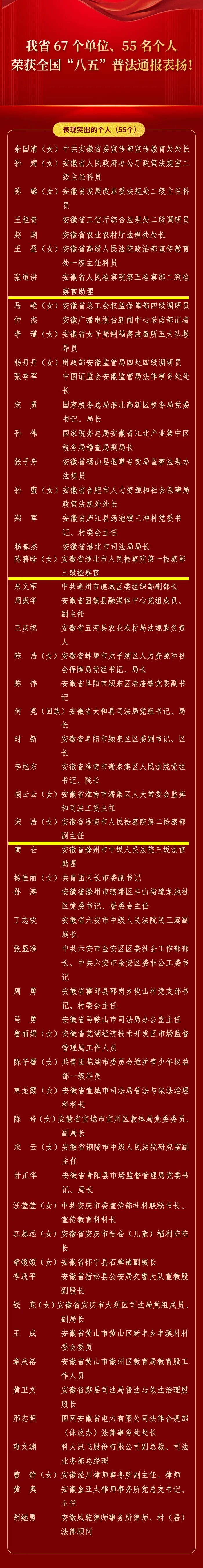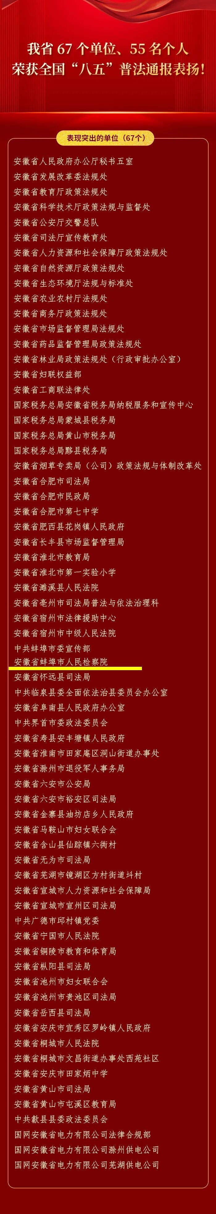 为提高各地、各部门行业开展法治宣传教育的积极性,进一步推动普法依法治理工作深入开展,近日,司法部、全国普法办印发《关于通报表扬全国“八五”普法中期表现突出的单位和个人的通知》,对中央纪委国家监委新闻传播中心专题部等1793个表现突出的单位,李庚等1556名表现突出的个人予以通报表扬。安徽67个单位和55名个人荣获表扬。