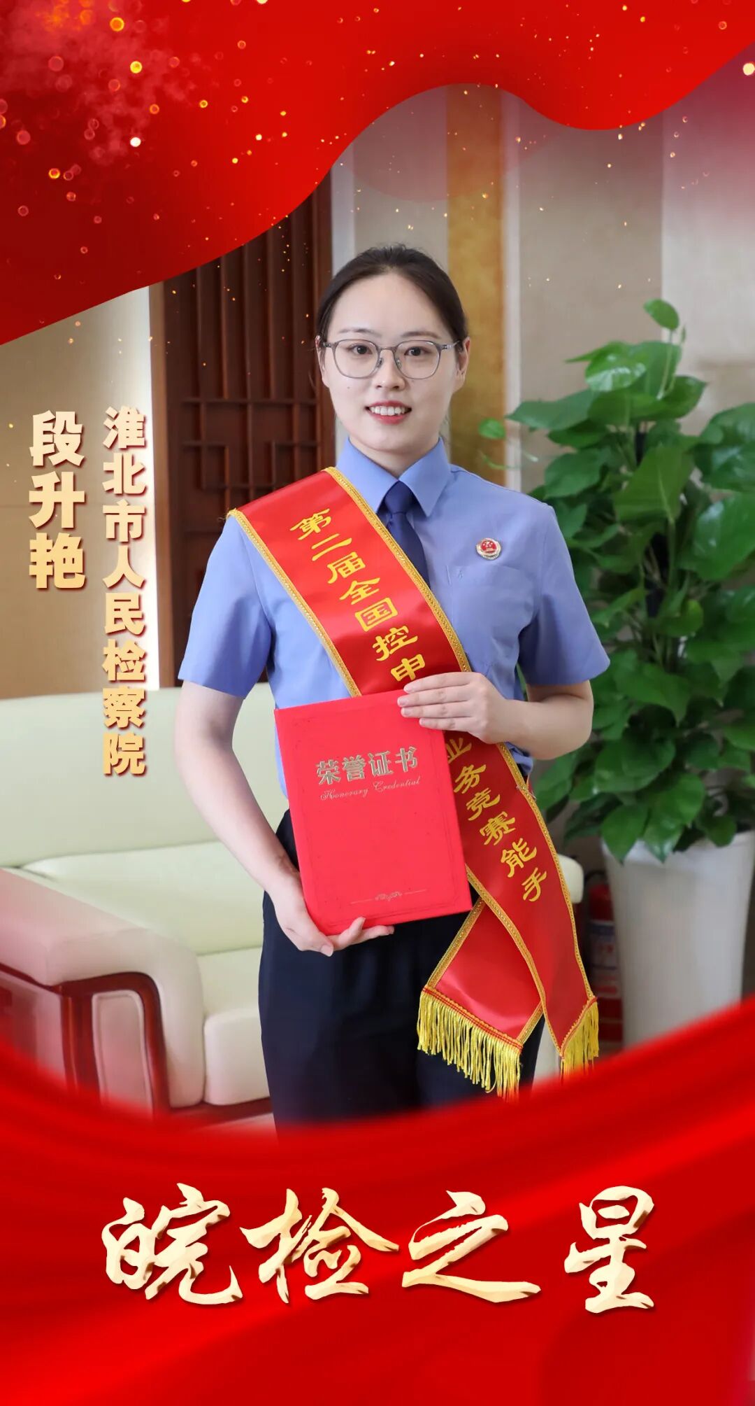 段升艳,2021年考入淮北市人民检察院,在控告申诉检察部门工作至今,现任五级检察官助理。凭着刻苦钻研、顽强拼搏的精神,求真务实、兢兢业业的态度,秉公用权、清正廉洁的作风,在平凡的岗位上干出了不平凡的业绩。三年多来,接待来访群众300余人次,处理来信700余件,协助检察官办理刑事申诉案件、司法救助案件200余件,尤其是参与办理的武某甲、武某乙国家司法救助案入选省妇联省检察院联合发布的十大典型案例。其个人连年被评为“全市信访工作先进个人”,先后荣获“第二届全省检察机关控告申诉检察业务竞赛标兵”、“第二届全国检察机关控告申诉检察业务竞赛能手”等荣誉称号。