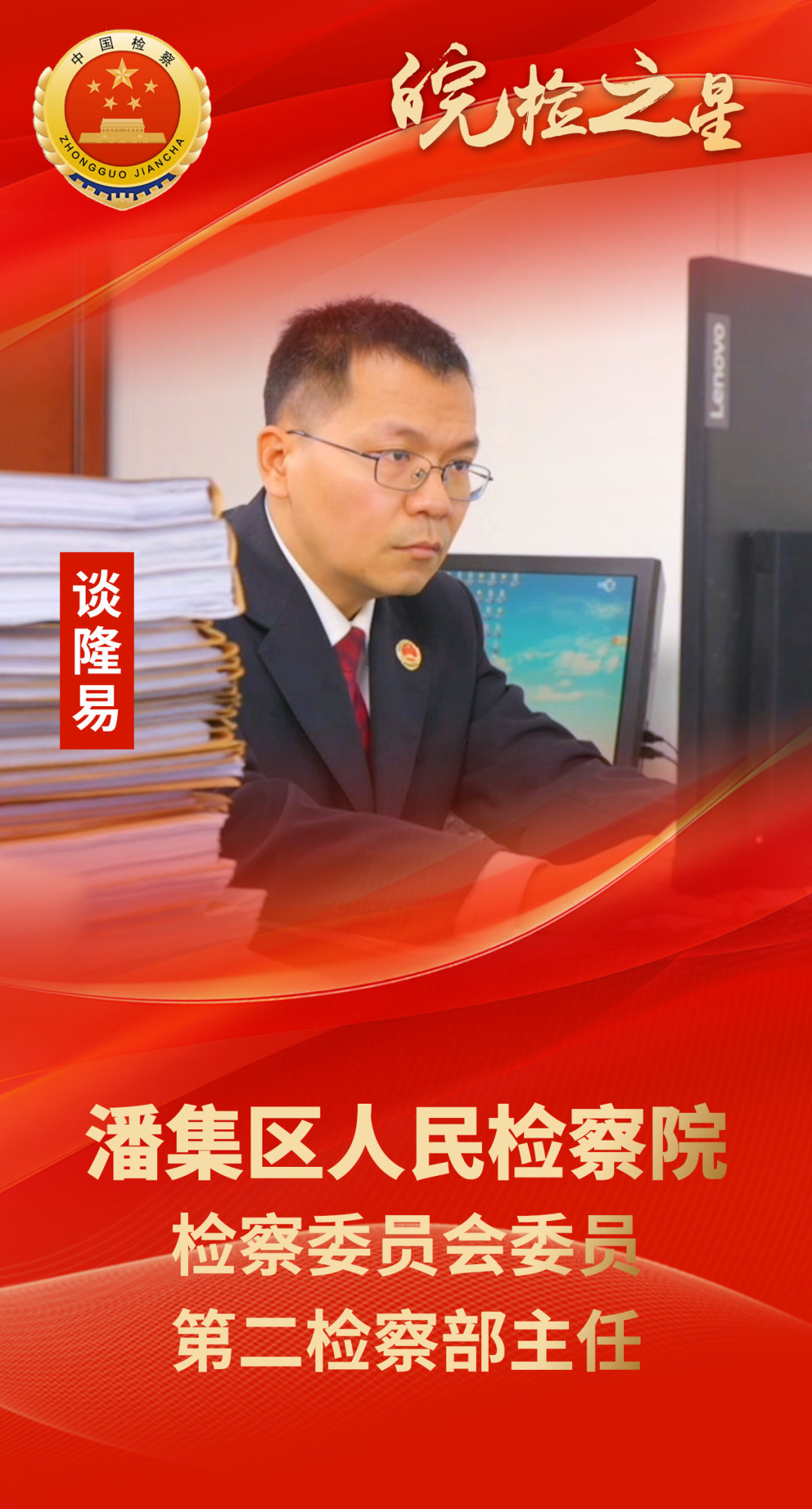 谈隆易,现任安徽省淮南市潘集区人民检察院检察委员会委员、第二检察部主任,主要承办民事、行政、公益诉讼案件,先后被评为淮南市潘集区优秀公务员、优秀共产党员、荣立个人三等功一次,入选安徽省检察机关调研骨干人才库、安徽省检察机关民事检察人才库、安徽省检察机关公益诉讼检察人才库。援藏期间谈隆易表现优异,被山南市人民检察院授予“优秀援藏干部”荣誉称号。从检12年来,谈隆易一直坚守在检察办案一线,扎实办好每一起案件,始终坚持在求知中增长才干,在实干中磨砺提升,以实际行动诠释新时代检察“排头兵”的工作情怀。