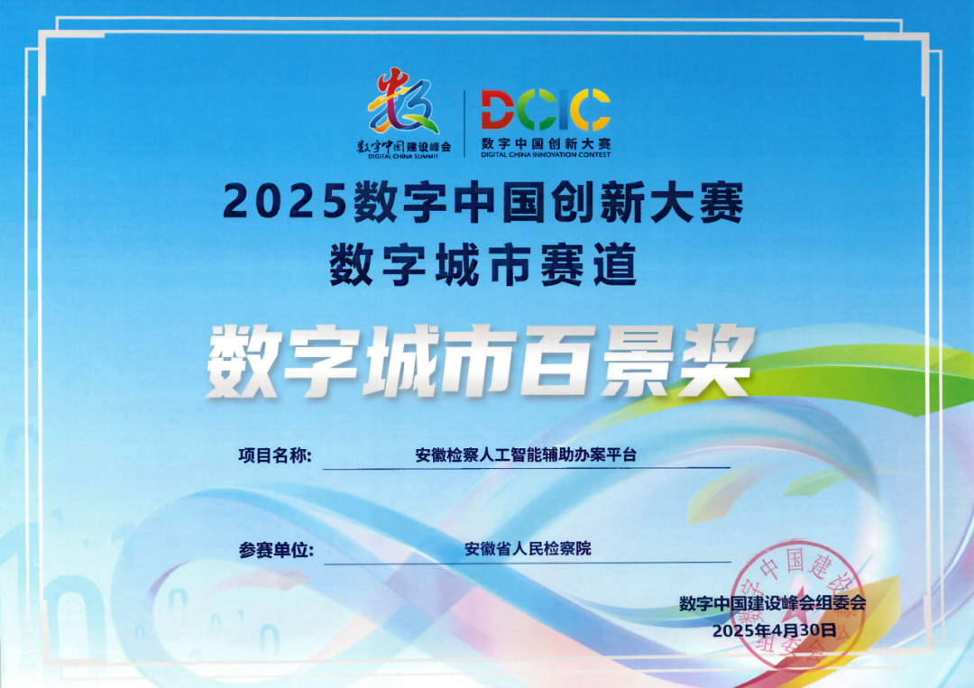 近日,2025数字中国创新大赛·数字城市赛道评选结果揭晓,安徽省检察院申报的“安徽检察人工智能辅助办案平台”项目从1300余件参赛作品中脱颖而出,取得第11名的成绩,获得数字城市百景奖。