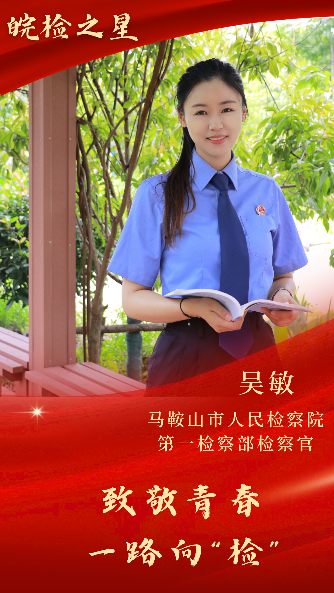 吴敏,马鞍山市人民检察院一级检察官。从书记员、检察官助理到检察官,从检十余年,她深耕公诉、未检一线,以匠心深耕办案主业,以温情守护未成年人成长,先后荣获“第三届全国检察机关未成年人检察业务能手”“安徽省维护妇女儿童权益先进个人”“安徽省优秀办案检察官”“第十四届全省检察机关优秀公诉人”“第二届全省检察机关未成年人检察业务标兵”等称号,荣立个人三等功两次,所办案件多次入选全国、全省典型案例,用青春书写新时代青年检察官的责任与担当。
