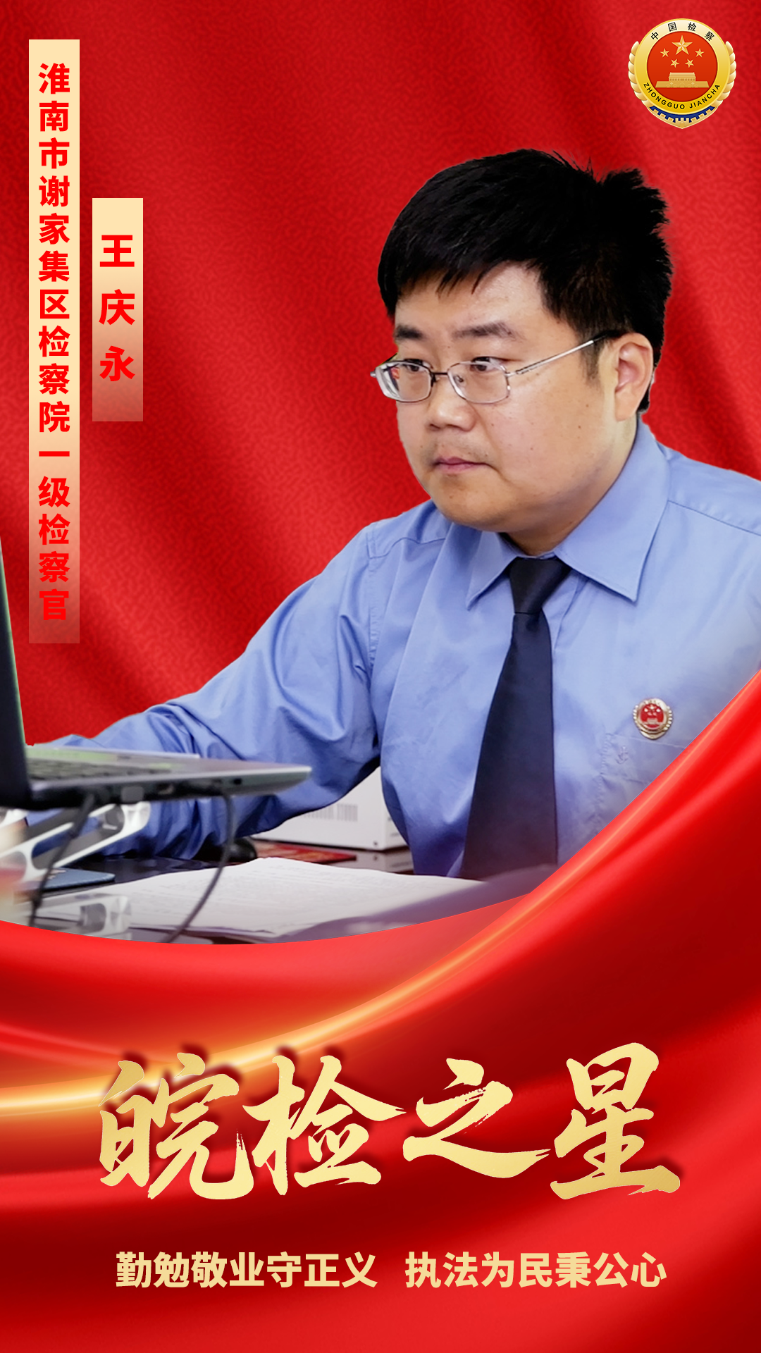 王庆永,现任淮南市谢家集区检察院一级检察官、第一检察部主任。他爱岗敬业,踏实工作,善于总结并创新工作方法,先后获得“安徽省职工职业道德建设标兵个人”“淮南青年五四奖章”“淮南市扫黑除恶专项斗争先进工作者”等荣誉称号。