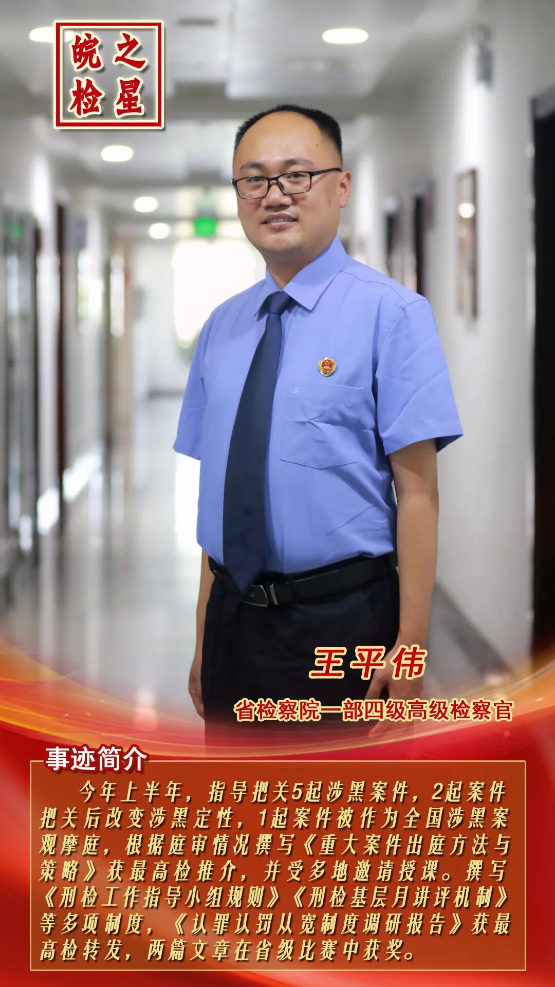 从控申、监所到侦监、公诉,从检十五年来,无论在哪个部门,他总是干一行、爱一行,忠诚履职、深耕细作,刻苦钻研各项业务知识,用实际行动践行着新时代人民检察官的神圣职责。他就是安徽省人民检察院普通犯罪检察部四级高级检察官王平伟。