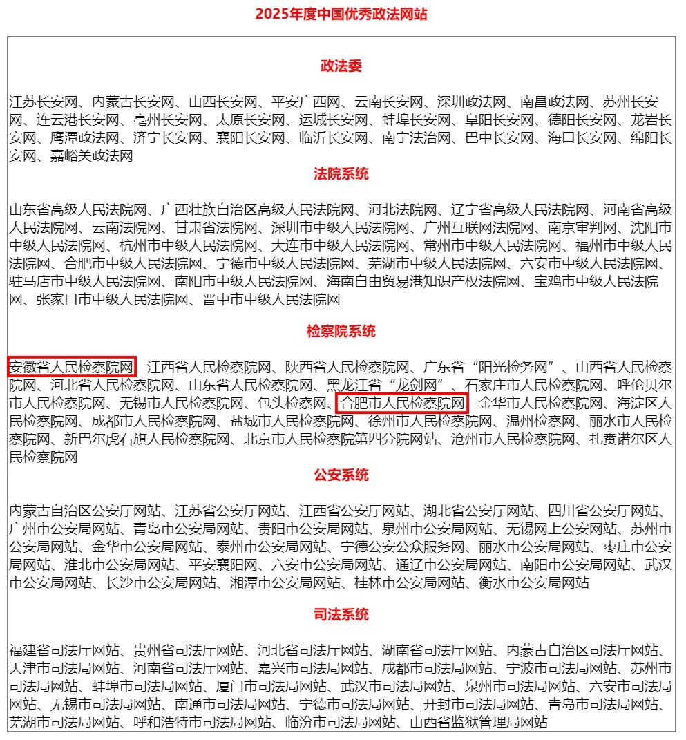 近日,中国信息化研究与促进网发布2025年中国优秀“互联网+政法服务”平台综合影响力评估报告,其中,安徽省人民检察院门户网站、合肥市人民检察院门户网站获评“2025年度中国优秀政法网站”,蚌埠检察(新媒体矩阵)获评“2025年度中国优秀政法新媒体”。