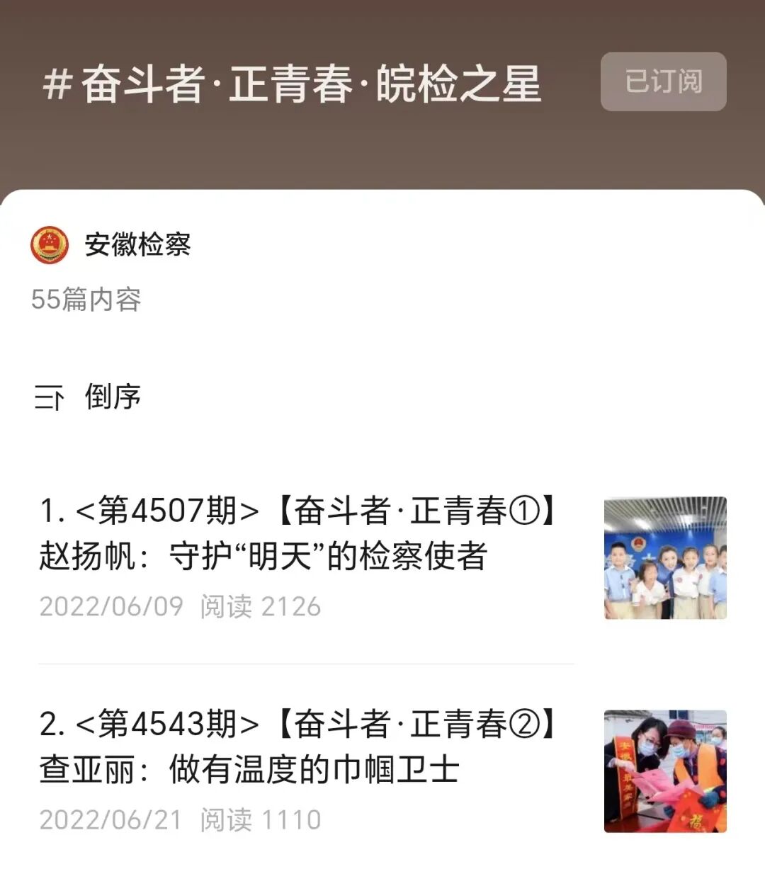 二是创设品牌栏目,蓄积典型势能。2022年6月,安徽省检察院结合安徽省委宣传部“奋斗者·正青春”主题宣传工作,进一步深化“皖检先锋”典型宣传机制,在省检察院各新媒体平台开设“奋斗者·正青春·皖检之星”专栏,常态化宣传先进典型。一方面,由各市检察院轮值,每半个月推荐一名“皖检之星”,全省16个市级检察院轮值结束后,再开始新一轮的推荐。另一方面主动“点题”,从各类业务竞赛、各类先进评选以及指导性案例、典型案例办理等工作中选树“皖检之星”。