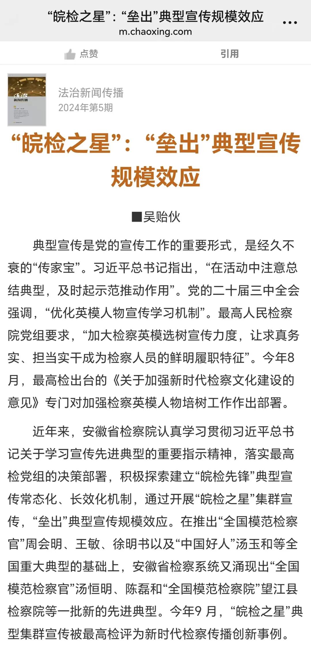 三是坚持选送推广,增强榜样示范。对于不同途径推选出的“皖检之星”,一方面利用全省检察新媒体矩阵进行全方位网络宣传;另一方面,主动向中央、省级主流媒体“喂料”,力求多方式、多载体、多视角宣传先进典型的事迹。对于获得省级以上表彰奖励或者特别优秀的“皖检之星”,则积极向安徽省委宣传部推荐。省委宣传部宣传后,省检察院又将之向最高检推荐展开全国性宣传,或者向省级以上各类评选活动推荐,给予表彰奖励,以扩大先进典型的示范性和影响力。