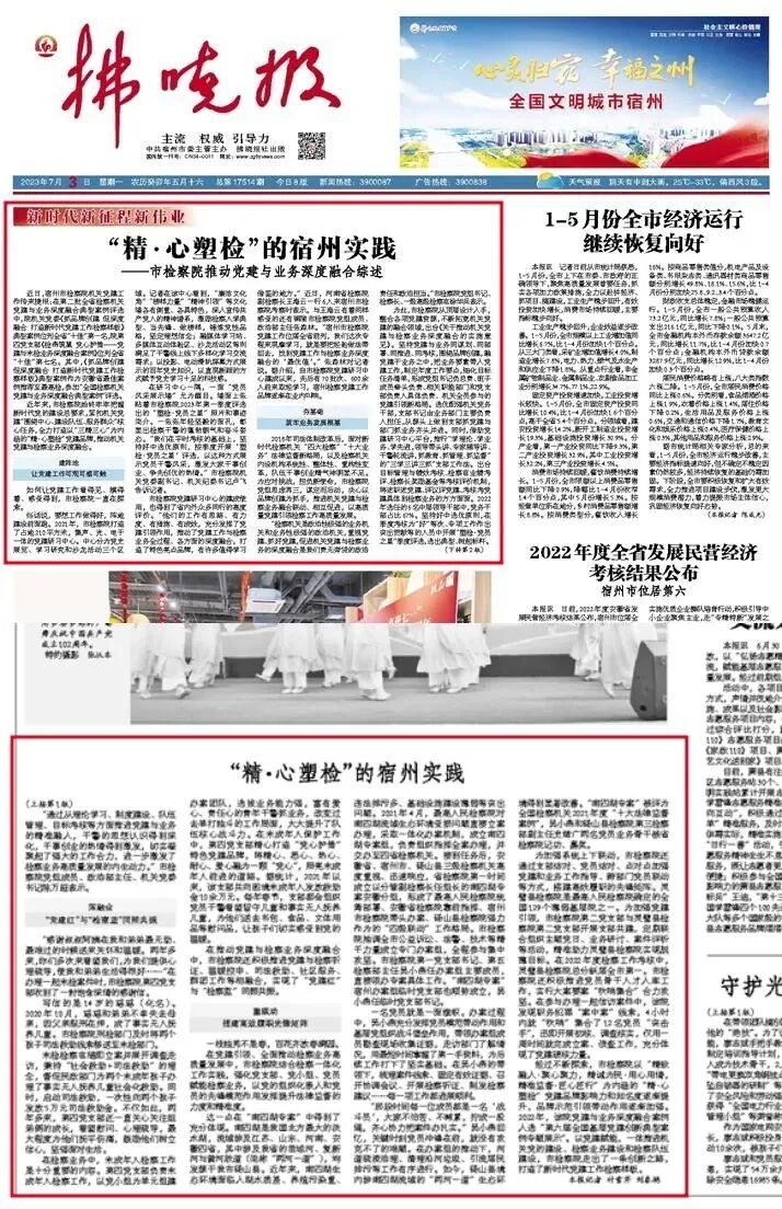 7月3日,宿州市委主管主办的《拂晓报》头版头条刊发深度报道《“精·心塑检”的宿州实践——市检察院推动党建与业务深度融合综述》。