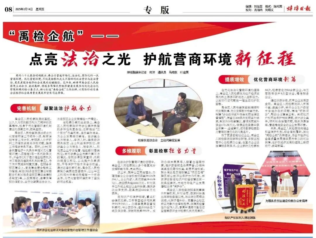 未来,禹会区人民检察院将健全权益保护机制,综合高效履职,深化“禹检企航”品牌建设,为全市经济社会高质量发展提供更为有力的司法保障,在护航经济发展的道路上砥砺前行、续写新篇。