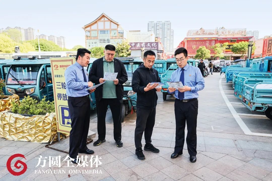药材专业市场外停车场内停满了前来采购中药材客商的三轮车,安徽省亳州市检察院检察官拿出法律宣传材料,向他们普及知识产权相关知识。
