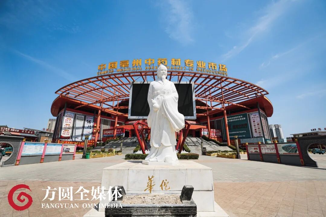 中国亳州中药材专业市场是全球规模最大的中药材专业市场、集散中心和价格形成中心。该市场外广场上竖立着一尊神医华佗像,亳州是华佗故里。
