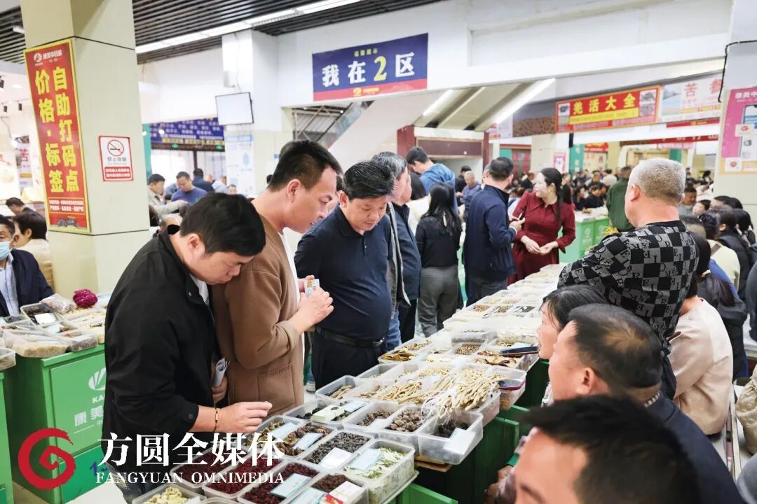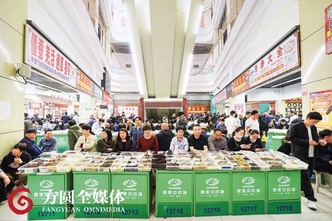 亳州中药材专业市场内人头攒动,货架上摆满中药材,可谓一应俱全。