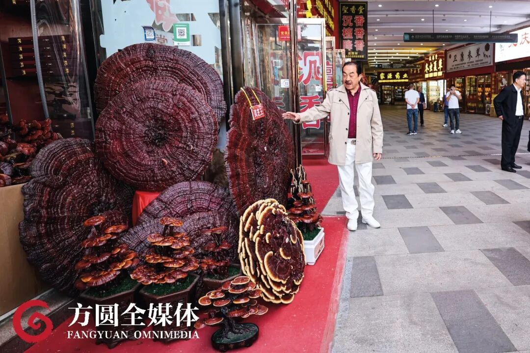 桌面大小的“灵芝王”摆放在一家专营灵芝的店铺门口,格外显眼。