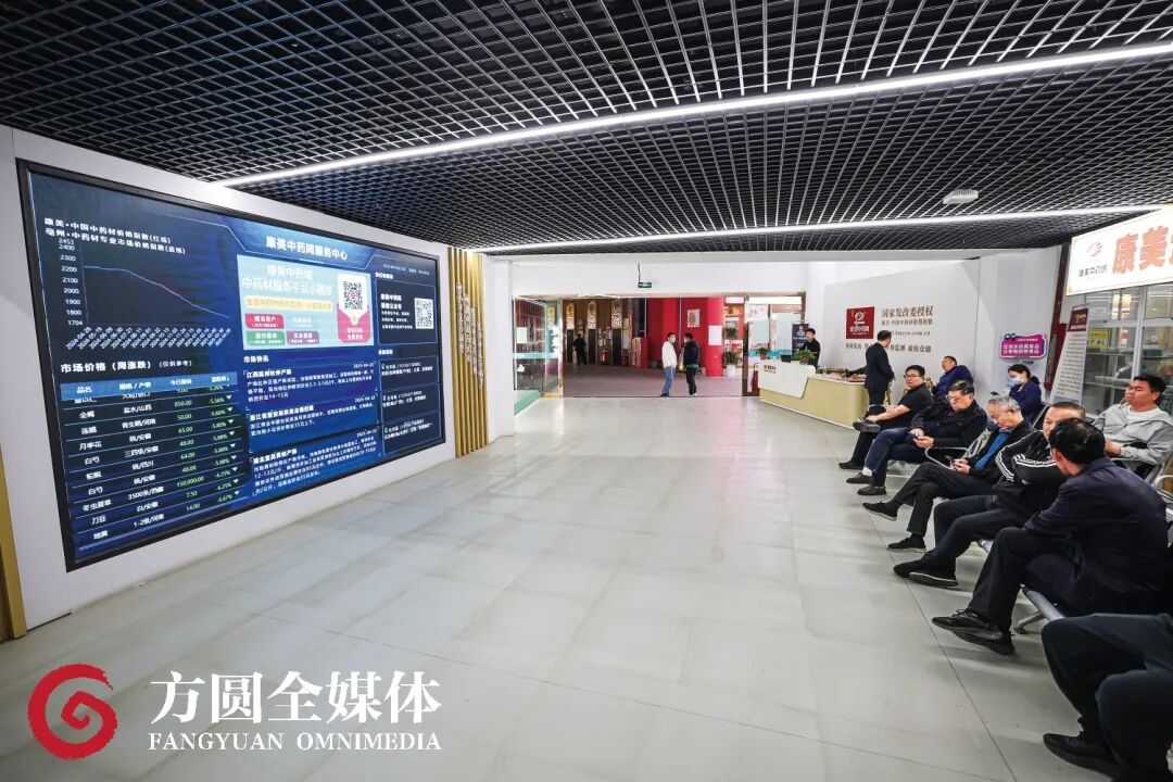 亳州中药材专业市场一楼的大屏幕上实时播放着各种中药材的市场涨跌价格,方便客商全面了解市场行情。