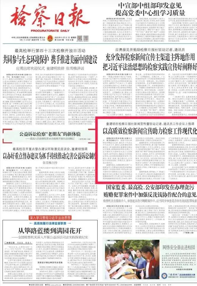 童建明特别指出,《检察日报》《人民检察》是最高检机关报、机关刊,最高检新媒体是最高检机关号,是检察意识形态的主阵地、检察新闻舆论工作的主渠道、人民群众了解监督检察工作的重要平台。各级检察院党组、院领导、部门负责人都要带头学好用好宣传好推介好机关报、机关刊、机关号,让人民群众更广泛更深入了解检察、关心检察、支持检察。