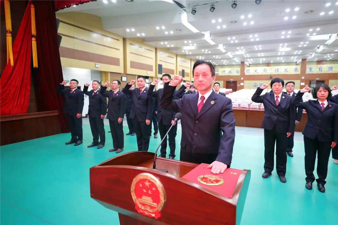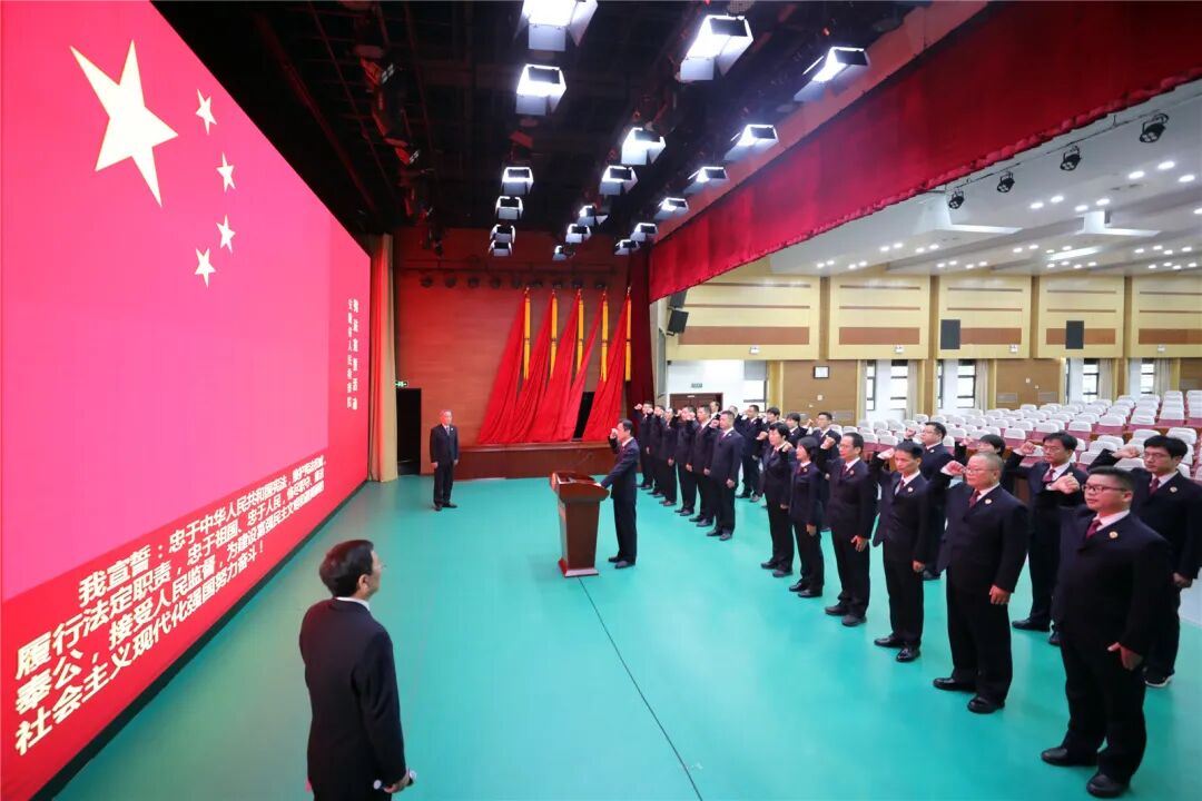 宣誓现场,庄严肃穆。全体宣誓人员身着检察制服面向国旗肃立,精神饱满,神情专注。宣誓活动在奏唱国歌中拉开序幕,领誓人左手抚按《中华人民共和国宪法》文本,宣誓人员右手举拳,庄严宣誓:“忠于中华人民共和国宪法,维护宪法权威,履行法定职责,忠于祖国、忠于人民......!”誓词铿锵有力,承诺掷地有声。