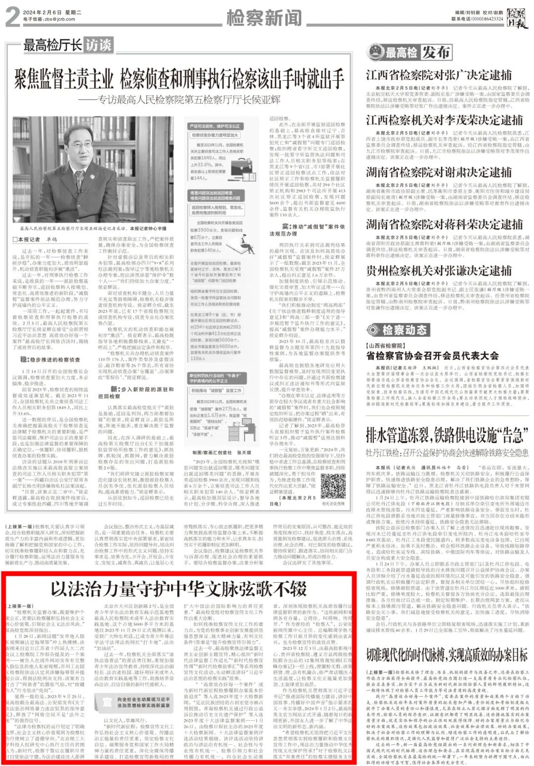 2023年是全面贯彻落实党的二十大精神的开局之年,检察机关是如何扛起使命、履职尽责的?取得了哪些成效?《检察日报》推出“迎全国两会·看检察风采”特别策划,以系列报道的形式全景展现检察机关2023年以来全面贯彻党的二十大精神,深入践行习近平法治思想,以检察工作新理念引领检察工作现代化、服务中国式现代化建设取得的新作为新进展,生动展示检察人员聚焦法律监督主责主业,坚持在“高质效办好每一个案件”中为大局服务、为人民司法、为法治担当的良好精神风貌。