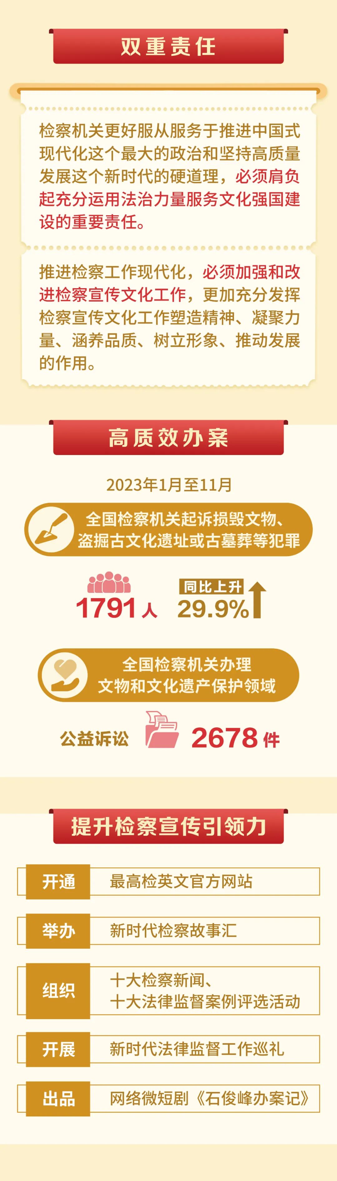 文化遗产承载着中华民族的基因和血脉,是传承中国文化和民族精神的重要载体。最高检明确要求,要充分发挥“四大检察”职能作用,坚持“高质效办好每一个案件”,为文化强国建设提供有力司法保障。