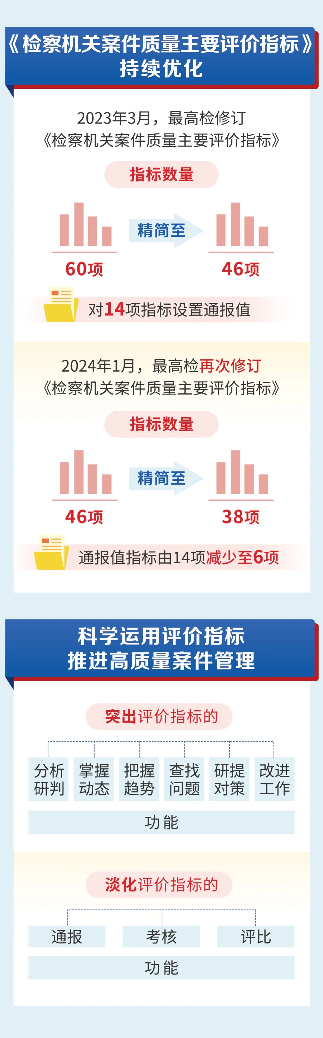 2024年1月,最高检2024年的第一次检委会会议再次聚焦修改完善《评价指标》,指标由46项精简至38项。