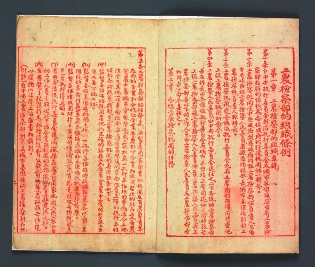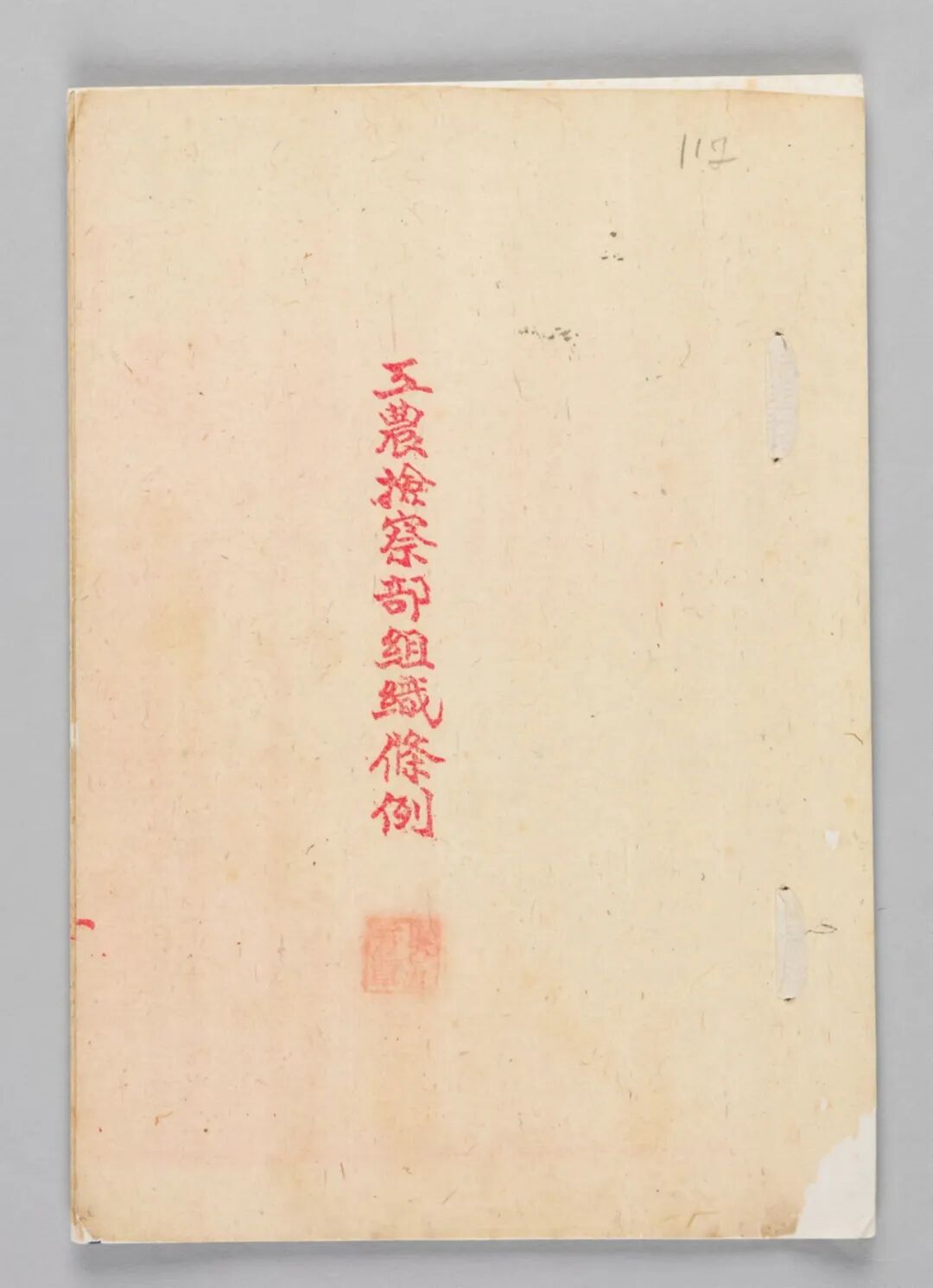 这是中华苏维埃共和国临时中央政府成立后制定的《工农检察部的组织条例》(下称《条例》),一级文物,收藏于中国国家博物馆。这本小册子封面为“工农检察部组织条例”,内文标题为“工农检察部的组织条例”,多了一个“的”字。参考《中华苏维埃共和国法律文件选编》等资料,本文确定为“工农检察部的组织条例”。
