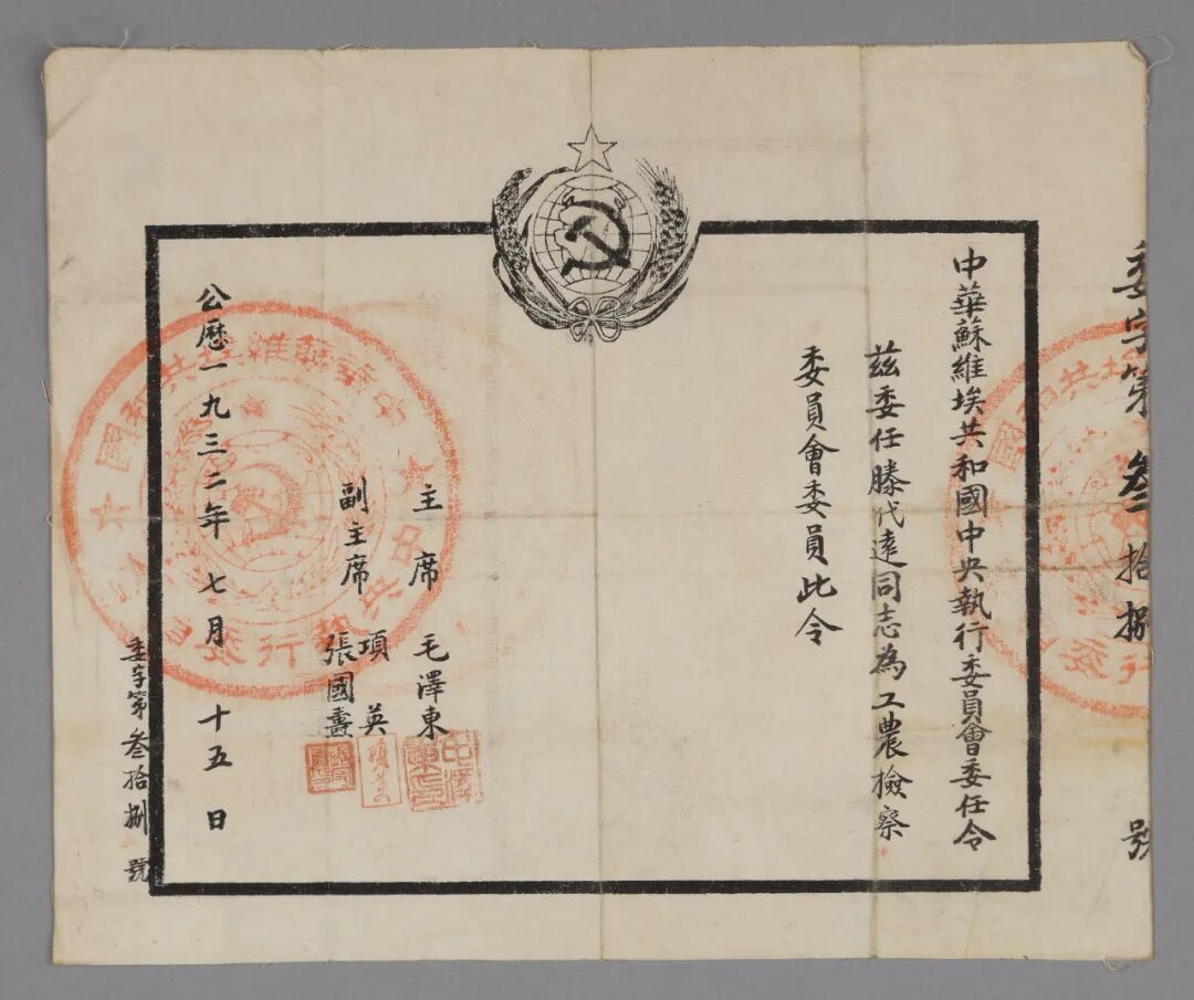 这是1932年7月15日,中华苏维埃共和国中央执行委员会委任滕代远同志为工农检察委员会委员的委任令。委任令的材质为棉麻纤维,采用石印技术,尺寸为29×24.1厘米。落款处有毛泽东、项英、张国焘三人的印章。其中毛泽东的这枚印章在上世纪三十年代初期较为常见,尤其是在签署中央执行委员会发布的各项任命和命令里。委任令左侧圆章的印文为隶书“中华苏维埃共和国中央执行委员会”,该印章藏于中国国家博物馆,银质,直径10.8厘米,高2厘米。右侧骑缝章为同款。委任令的上方印有中华苏维埃共和国国徽。滕代远同志逝世后,此件文物由其夫人林一同志于1976年1月3日捐赠给中国革命历史博物馆(中国国家博物馆前身)。