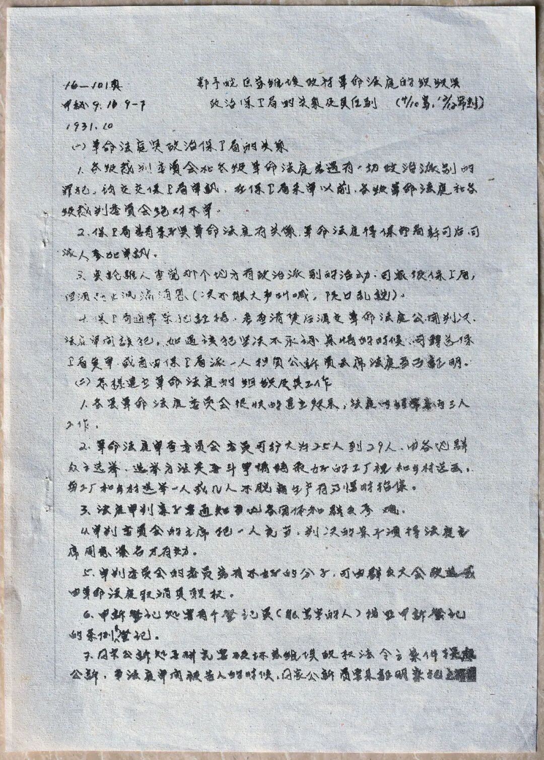 这是一份收藏于湖北省档案馆的史料——《鄂豫皖区苏维埃政府革命法庭的组织与政治保卫局的关系及其区别》。1930年6月,鄂豫皖革命根据地正式形成后,于1931年7月颁布了《鄂豫皖苏维埃政府临时组织大纲》,规定革命法庭配备委员若干人、主席一人。内设审判委员会(正审一人,副审若干人)、国家公诉员、辩护员等。