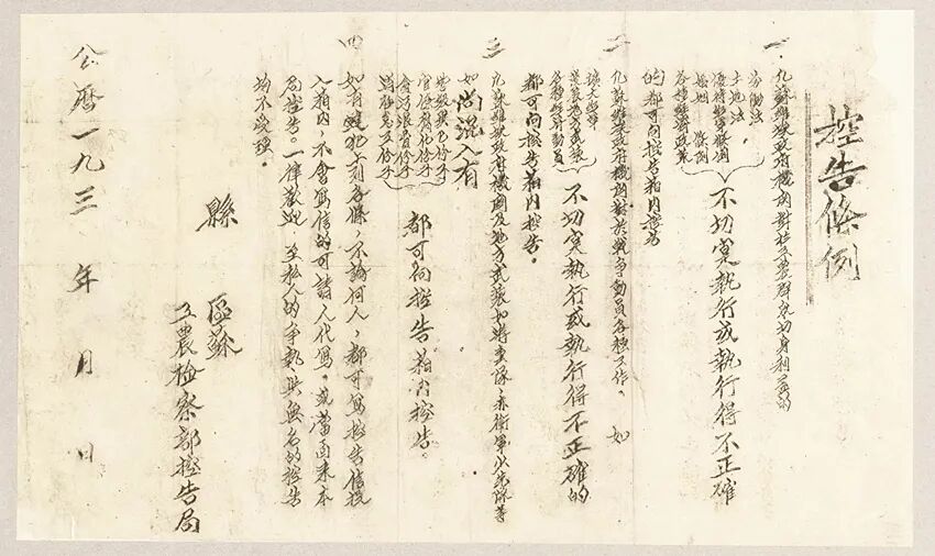《控告条例》共4条,前3条是关于受理控告的范围,第4条是关于控告的方式,其文字与兴国县高兴区苏维埃政府工农检察部控告局控告箱上直白通俗的文字相比,采用了列举方式,关于受理控告范围的表述更为明晰。