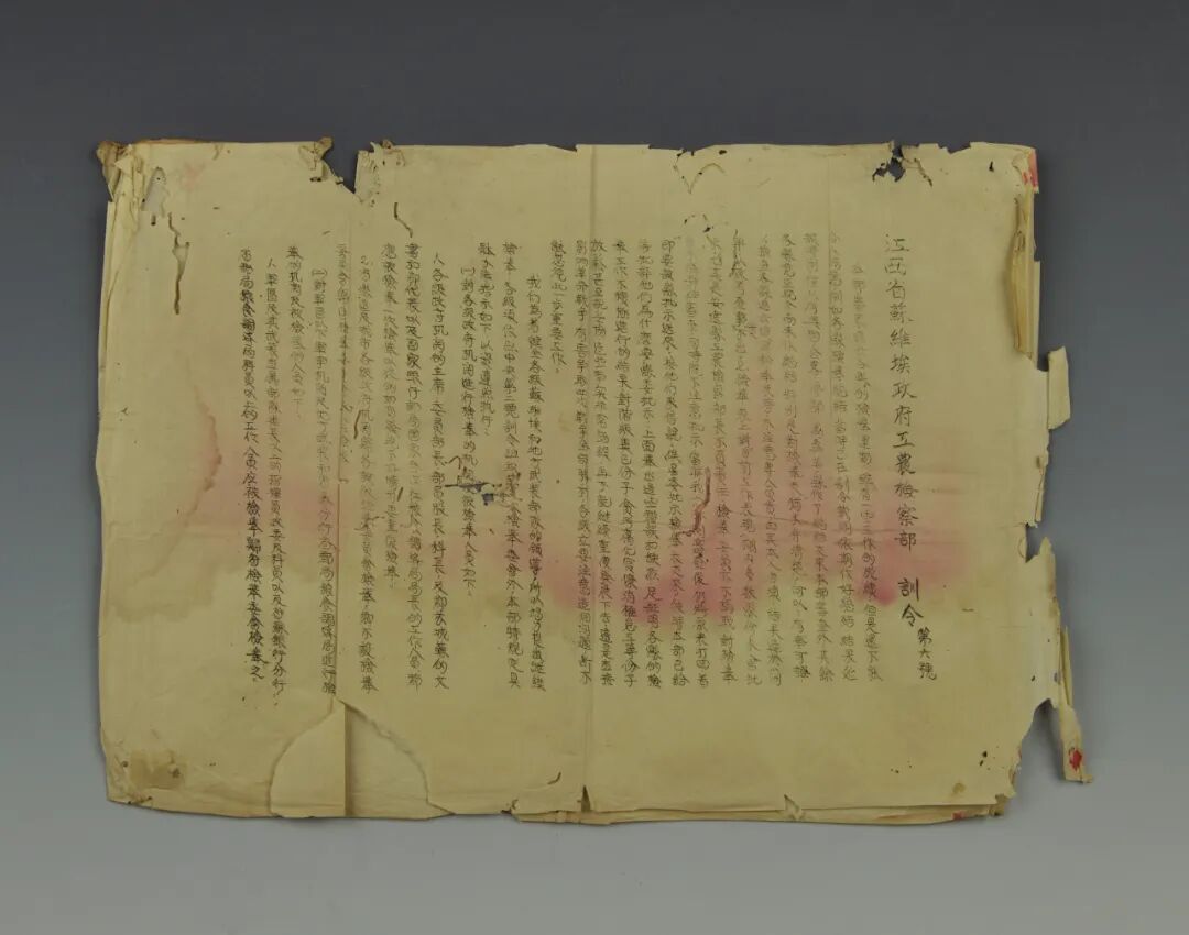 这是1933年5月20日江西省苏维埃政府工农检察部发布的第六号训令,三级文物,收藏于瑞金中央革命根据地纪念馆。