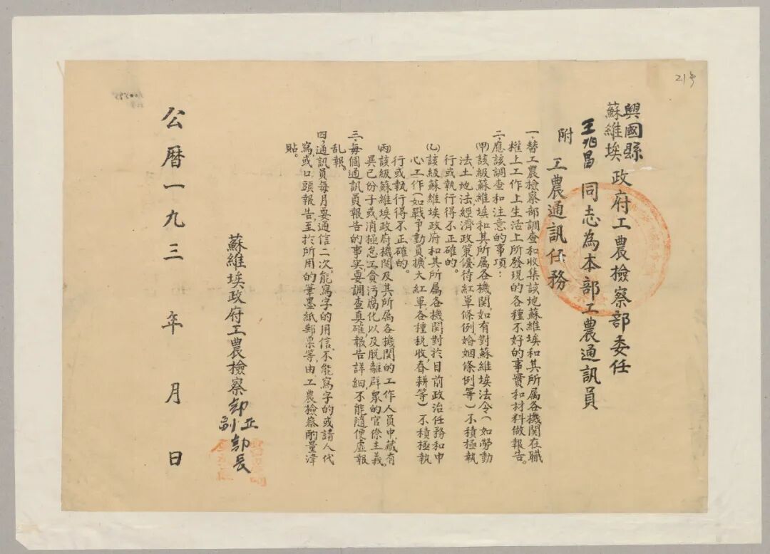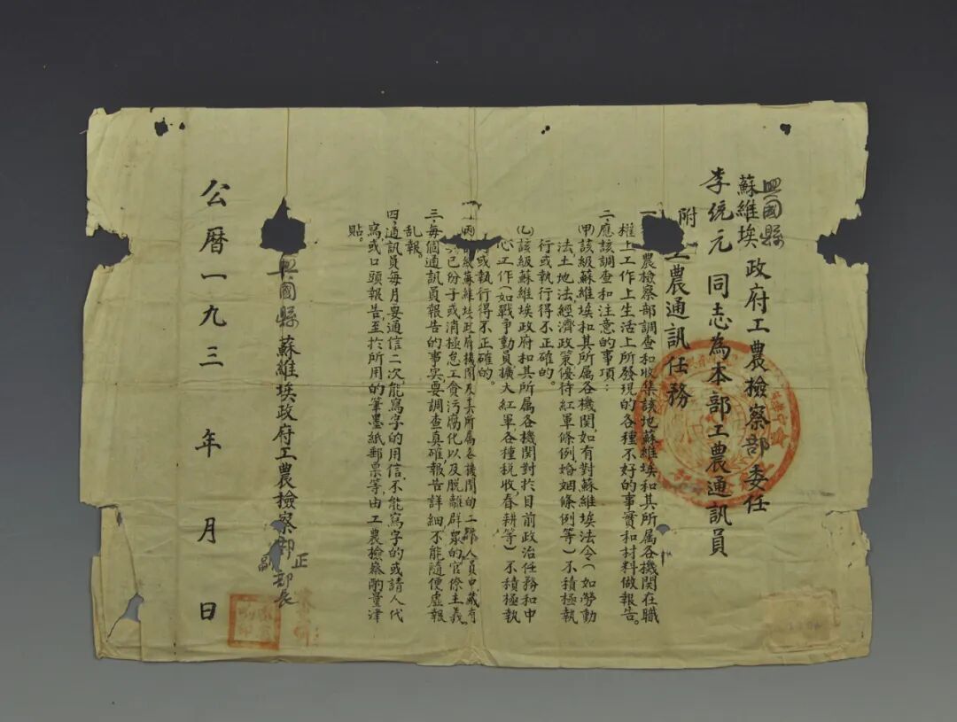 这是兴国县苏维埃政府工农检察部委任李统元和王兆昌为工农通讯员的委任状,分别收藏于瑞金中央革命根据地纪念馆、中国国家博物馆。