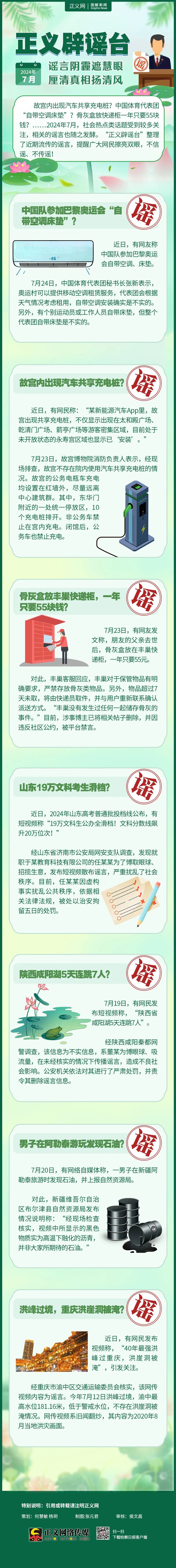 故宫内出现汽车共享充电桩?中国体育代表团“自带空调床垫”?骨灰盒放快递柜一年只要55块钱?……2024年7月,社会热点类话题受到较多关注,相关的谣言也随之发酵。“正义辟谣台”整理了近期流传的谣言,提醒广大网民擦亮双眼,不信谣、不传谣!