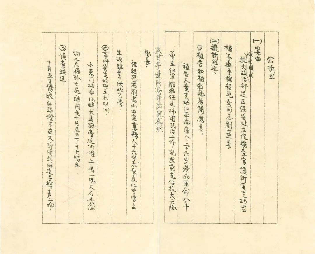 公诉书除首部、尾部外,只有“案由”和“提诉经过”两部分。案由:“检察机关抗大政治部、边区保安处、法院检察官提诉黄克功因婚不遂枪杀死女同志刘茜一案。”之所以抗大政治部、边区保安处和法院检察官共同作为“检察机关”,这与苏区时期就存在的群众团体派员出庭做国家原告人的制度有关。1932年6月颁布的《裁判部的暂行组织及裁判条例》第二十三条规定:“开庭审判时,除检察员出庭做原告人外,与群众团体有关系的案件,该群众团体也可派代表出庭做原告人。”