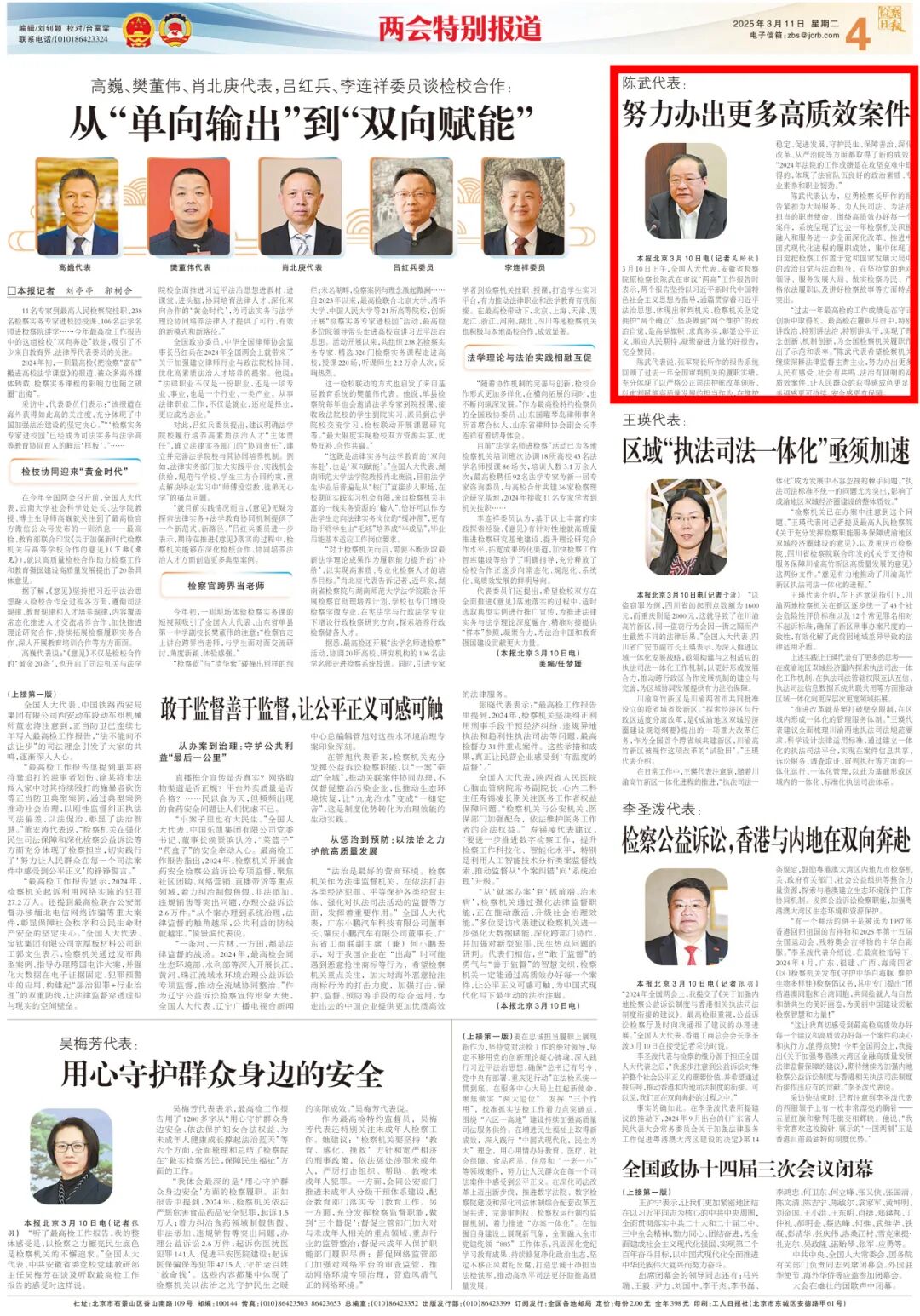 “过去一年最高检的工作成绩是在守正创新中取得的。最高检在履职尽责中,特别讲政治、特别讲法治、特别讲实干,实现了理念创新、机制创新,为全国检察机关履职作出了示范和表率。”陈武代表希望检察机关继续深耕法律监督主责主业,努力办出更多人民有感受、社会有共鸣、法治有回响的高质效案件,让人民群众的获得感成色更足、幸福感更可持续、安全感更有保障。