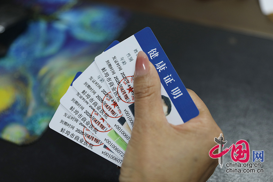 龙子湖区曹山街道卫生服务中心工作人员展示所办理出的健康证。中国网记者 马旷/摄