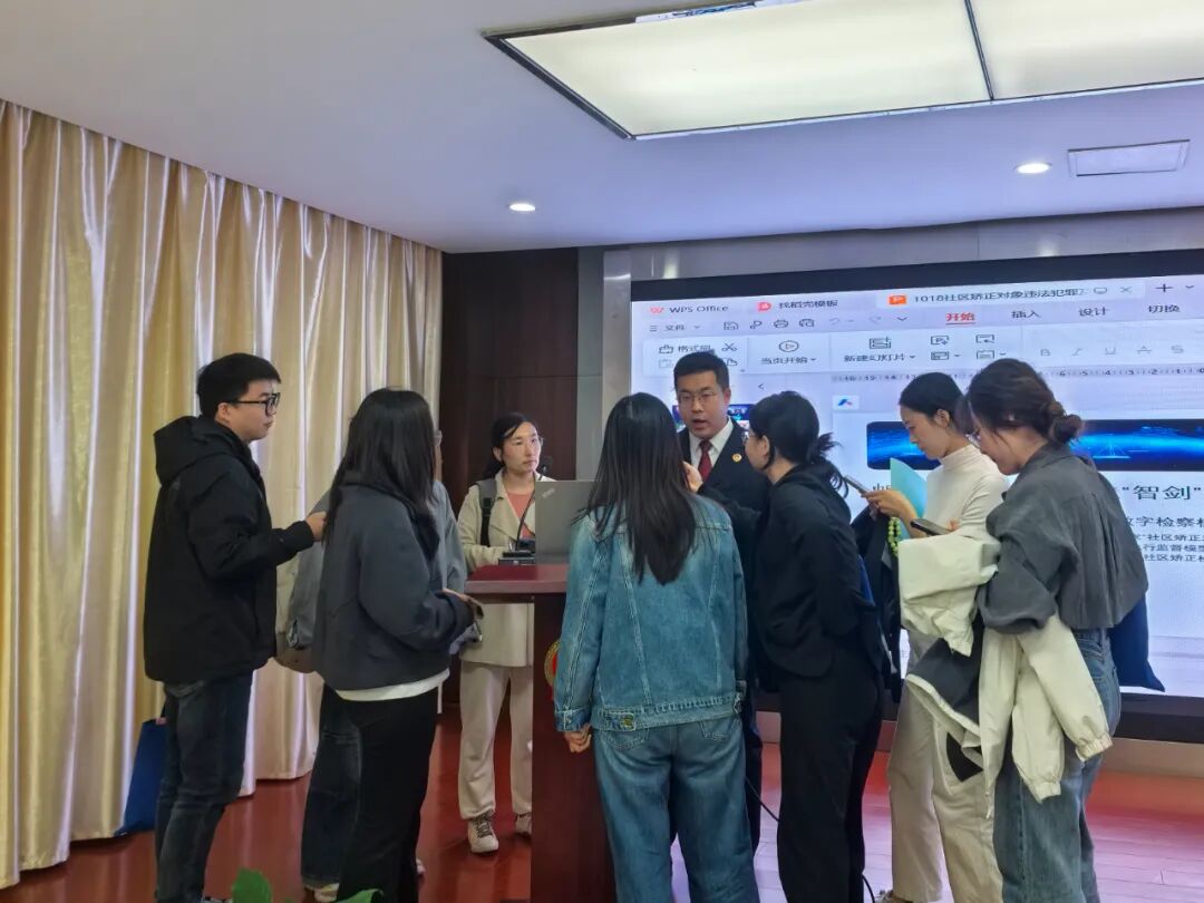 图为无为市检察院检察官助理张志成向采访团介绍该院坚持数据赋能,积极研发应用“社区矫正对象违法犯罪及收监执行监督模型”有关情况。