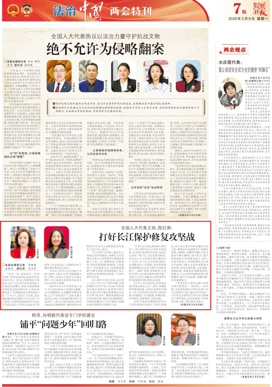 “长江保护法的核心就是长江流域生态环境修复。检察机关在办理的许多长江保护案件中都很好地融入了这一点。增殖放流、补植复绿、劳动代偿等替代性修复,不仅起到了‘非法捕捞必究、资源损害要赔’的警示效果,更直接促进了长江流域生态环境的良好修复。”王琼代表告诉记者。