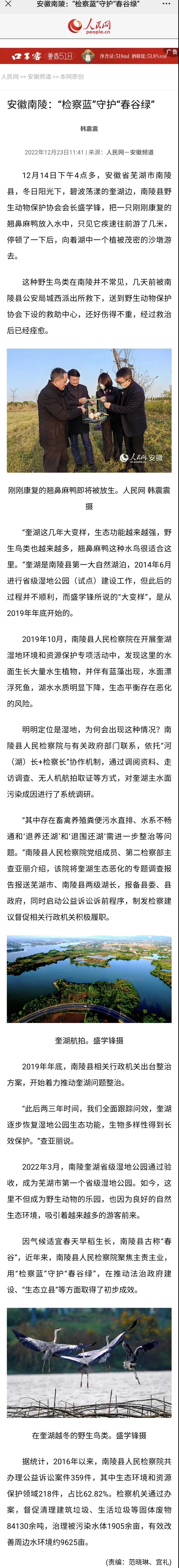 2022年12月23日,人民网发布文章《安徽南陵:“检察蓝”守护“春谷绿”》,报道南陵县人民检察院公益诉讼工作。