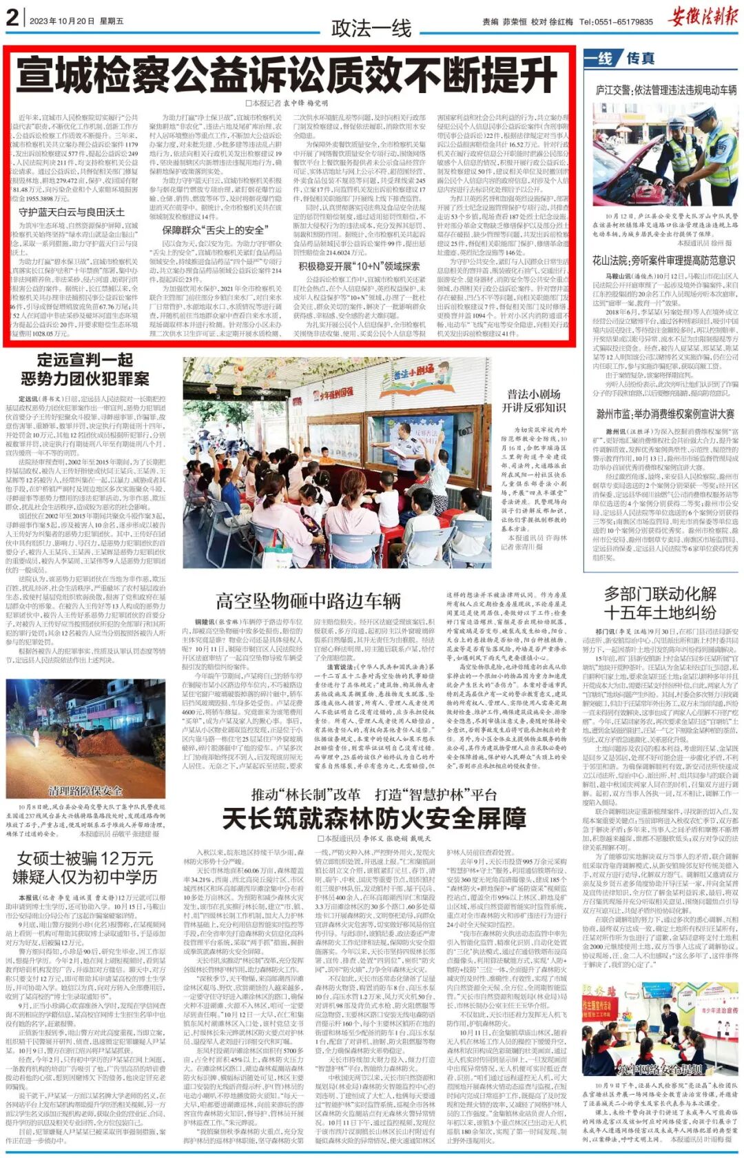 公益诉讼检察工作中,宣城市检察机关还紧盯社会热点,在个人信息保护、英烈权益保护、未成年人权益保护等“10+N”领域,办理了一批社会关注、群众关切的案件,解决了一批影响群众获得感、幸福感、安全感的老大难问题。