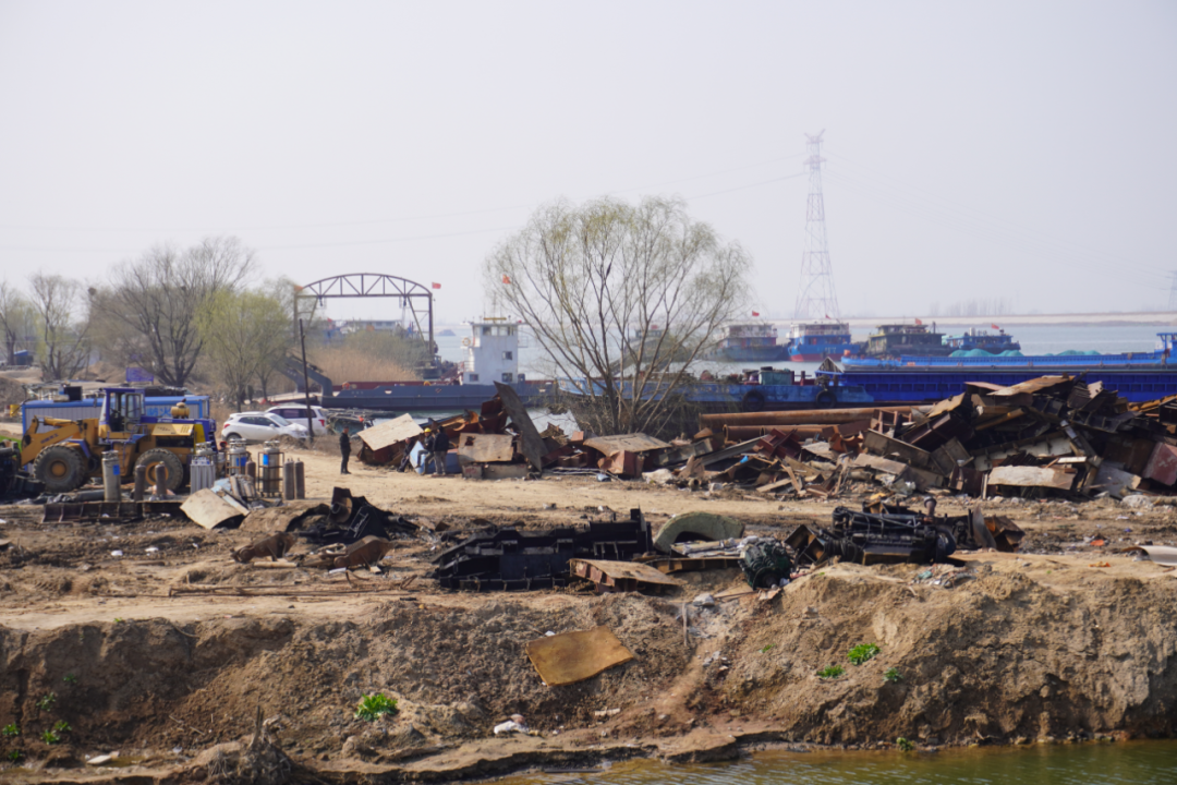 “轰隆隆隆……”随着现场大型拆卸运输车启动轰鸣,又一艘被拆解成废钢块的船舶残骸被转运离场,在工人们的有序作业中,一处处被非法船舶占用的沿淮土地被清理、恢复。